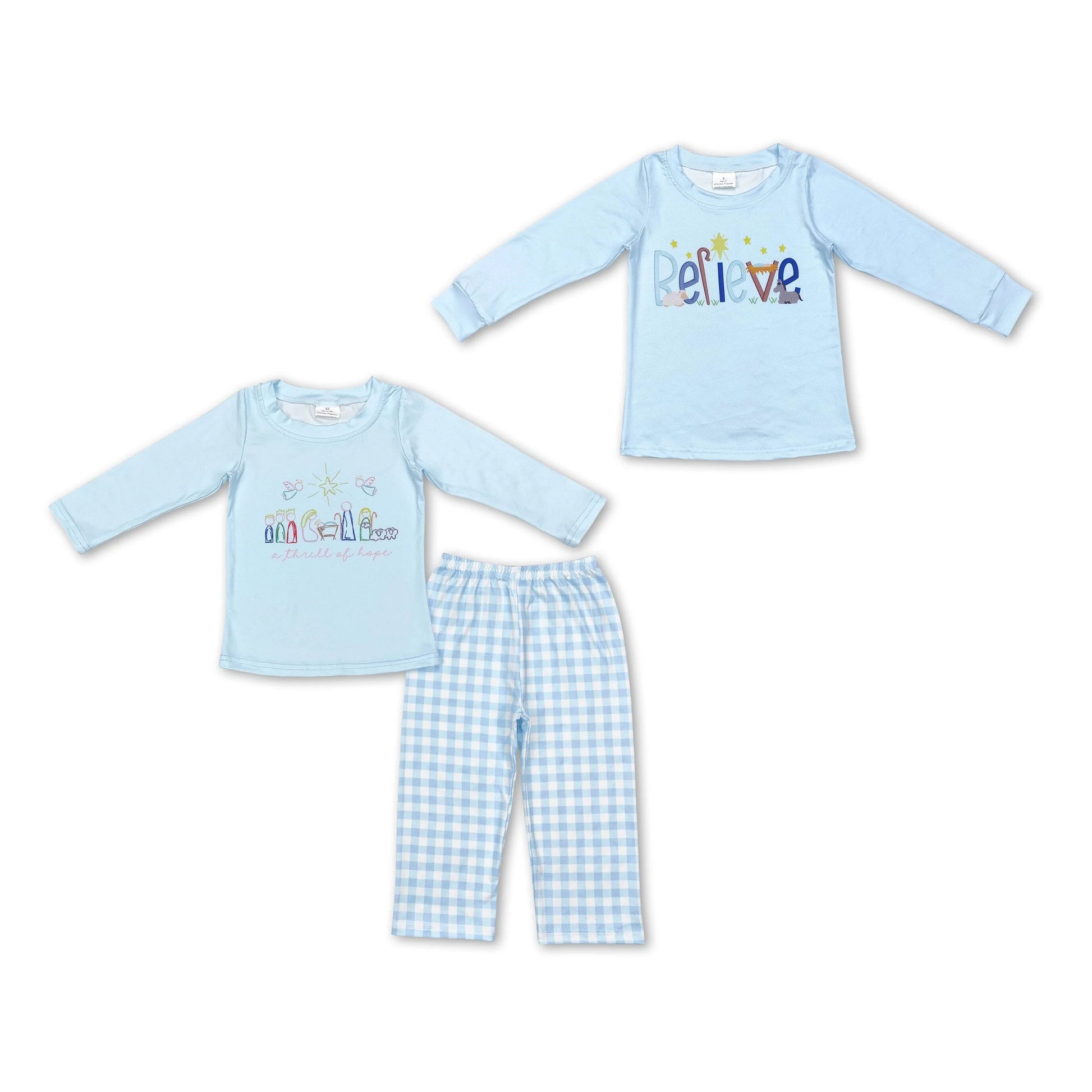 RTS NO MOQ BT0775 BLP0504 Sky blue long-sleeved suit & long-sleeved top with colorful letter pattern