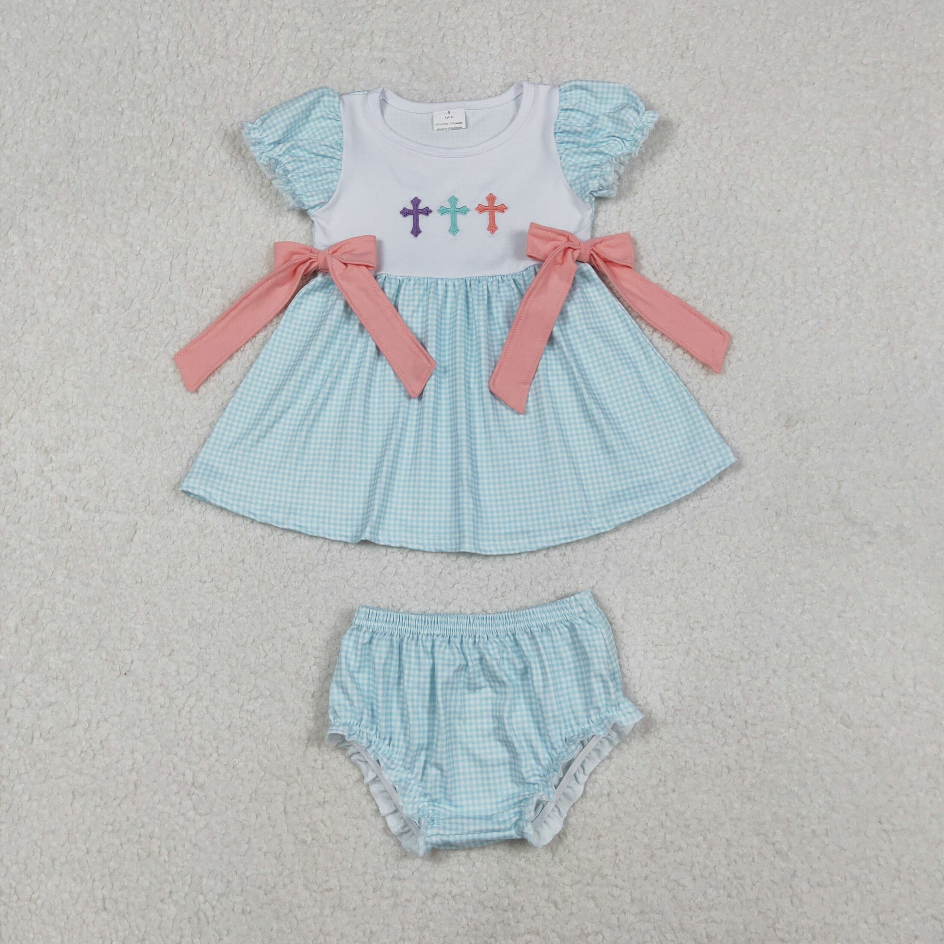 RTS NO MOQ(In Stock) GBO0480 Embroidered Easter Cross Pink Bow Blue Plaid Long-Sleeved Briefs Set
