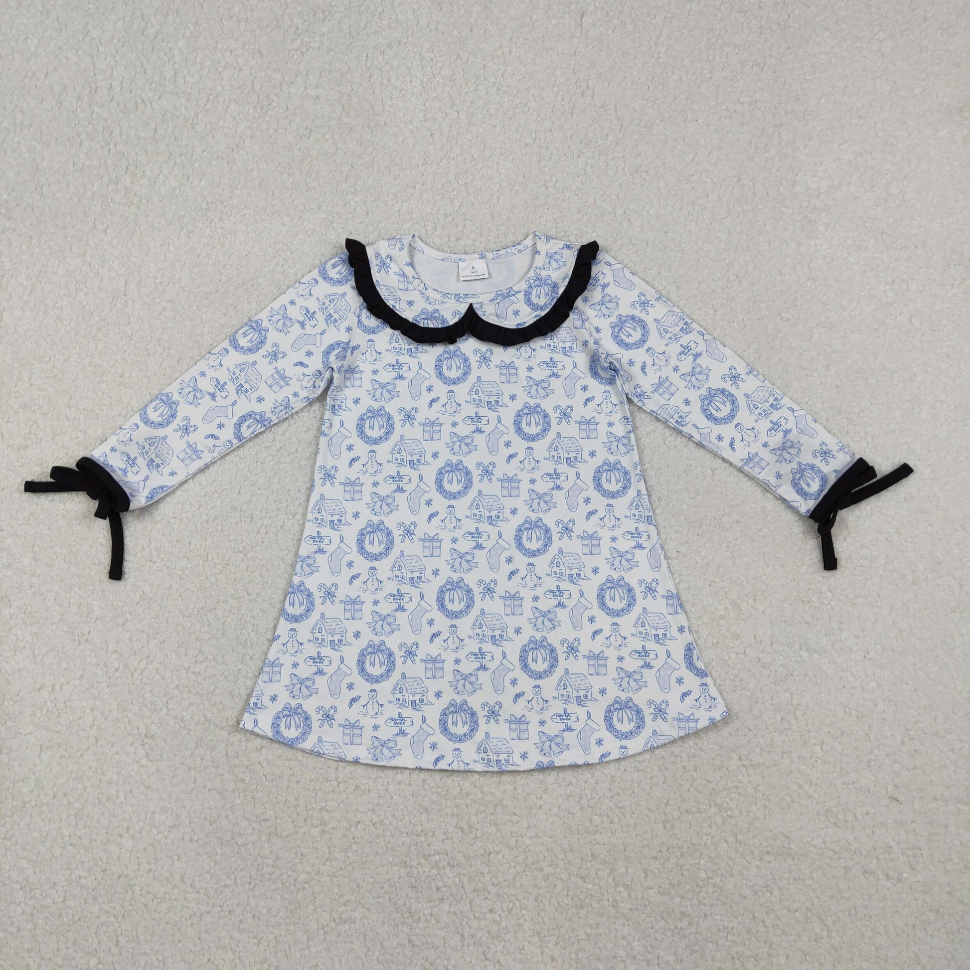 RTS NO MOQ(In Stock) GLD1346 Christmas Snowman Wreath Stockings Bow Pattern Lace Peter Pan Collar Long-Sleeved Dress