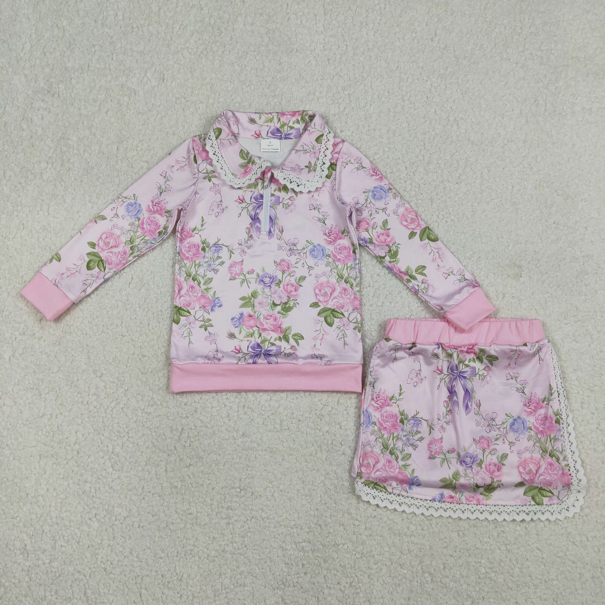 RTS NO MOQ(In Stock) GLD1572 Pink Zipper Long-Sleeve Midi Skirt Set with Floral and Leaf Peter Pan Collar