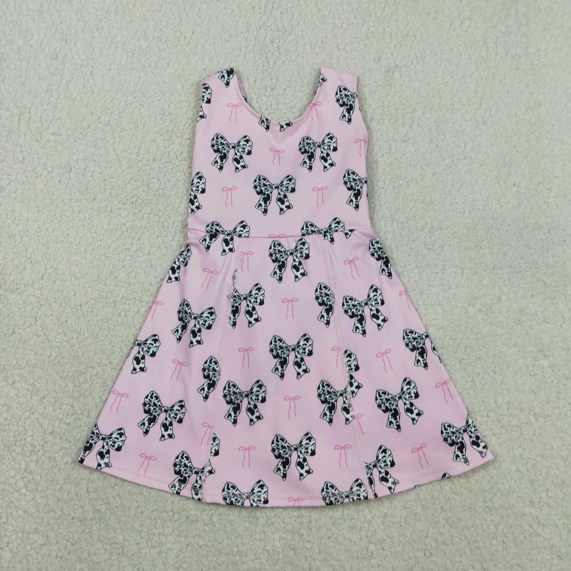 RTS NO MOQ Sibling Baby Girls Western Cow Print Bow Sleeveless Skort Knee Length Dresses Infant Pink Tassel Rompers